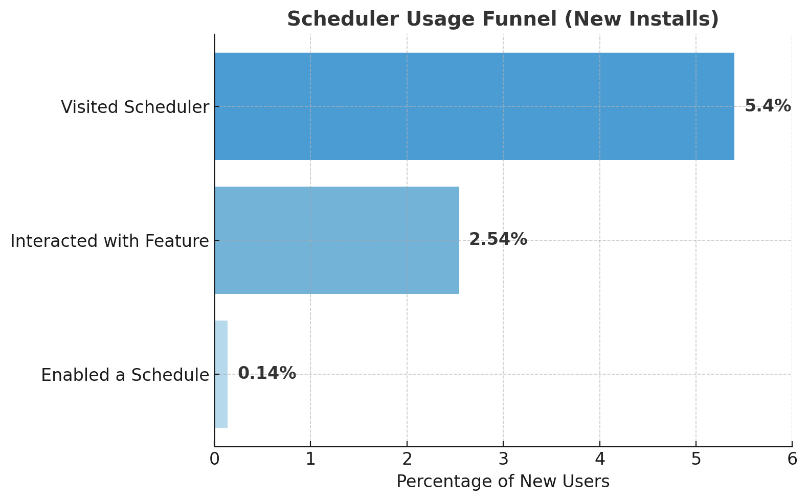 • Discovery and engagement with the Scheduler were extremely low, with the steepest drop-off between visiting the feature and enabling a schedule